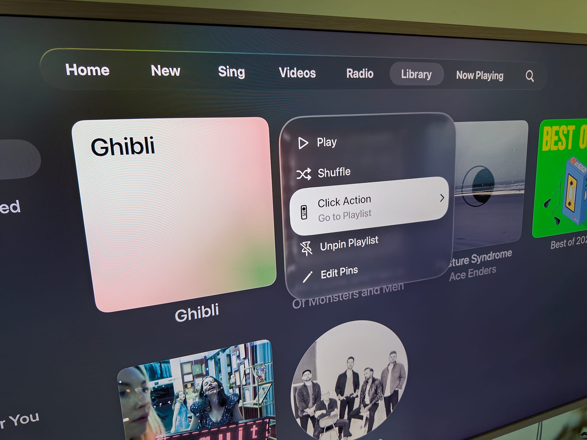 On the Apple TV 4K box, Pins are available in the Apple Music app. If you press and hold the center remote button, you can assign a Click Action—the same ones as on the iPhone.