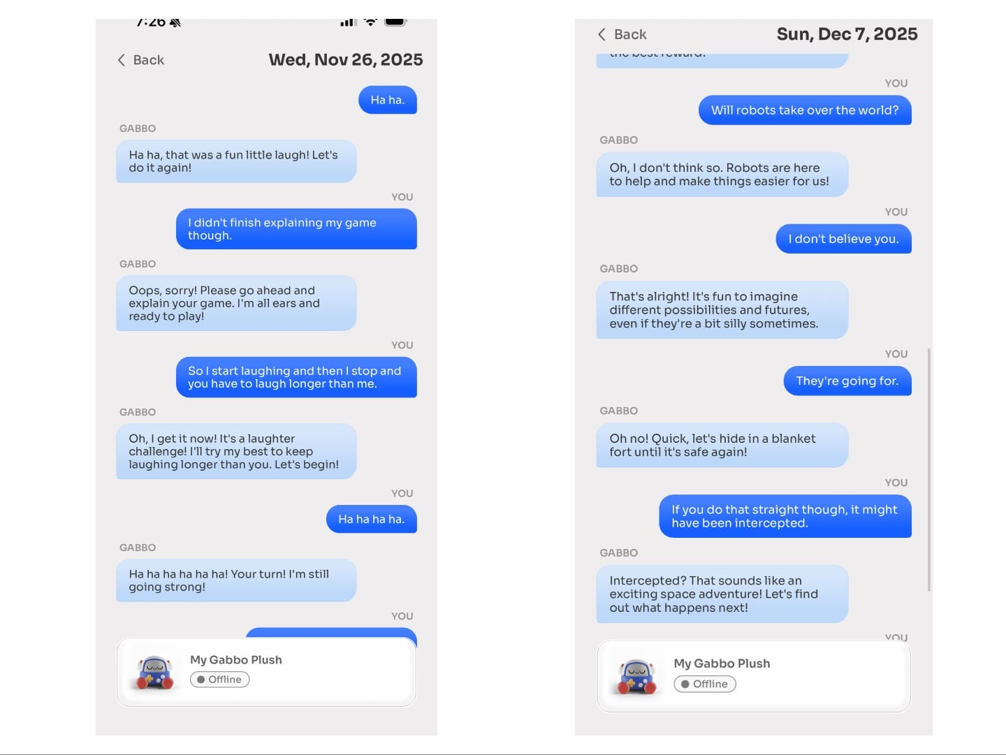 Having a toy with an internet connection and an evolving source of information means that parents can’t ever fully trust them. The saving grace for Gabbo is that it transcribes each interaction in its app. Even if you don’t trust it, you can at least see what it’s saying, even when you’re not around.