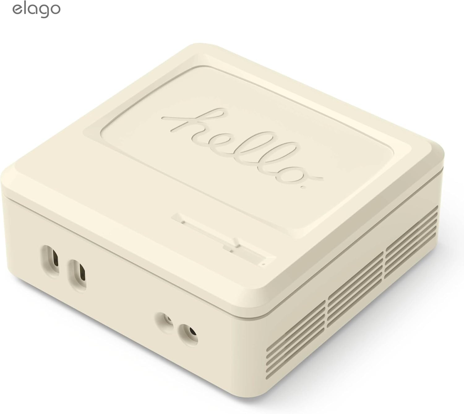 The Elago Mac mini M4 Silicone Cover harkens back to the classic Macintosh days. The low-cost cover gives the new Mac mini M4 a retro look and some minimal protection if you are putting it in a bag or traveling with it. The top of the cover has the classic Hello cursive greeting along with a faux floppy disk drive. All of the ports remain exposed and available for use, so this can be left on during normal day-to-day use.