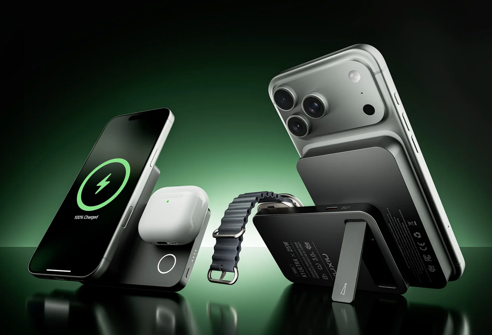 The KUXIU K1 Ultra power bank looks like a typical magnetic one, but it slides open to reveal a hidden Apple Watch charger. It features an additional USB-C port to charge three devices at once. Of course, newer AirPods can wirelessly charge on Apple Watch chargers if your watch doesn't need power.
