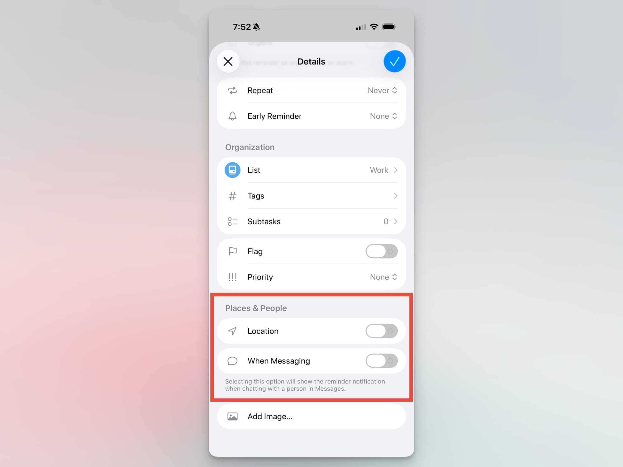The Phone app integration is neat, but it’s not the only way to remind you when communicating with someone. You can also set a task in Reminders to send you a notification when you’re messaging a contact.