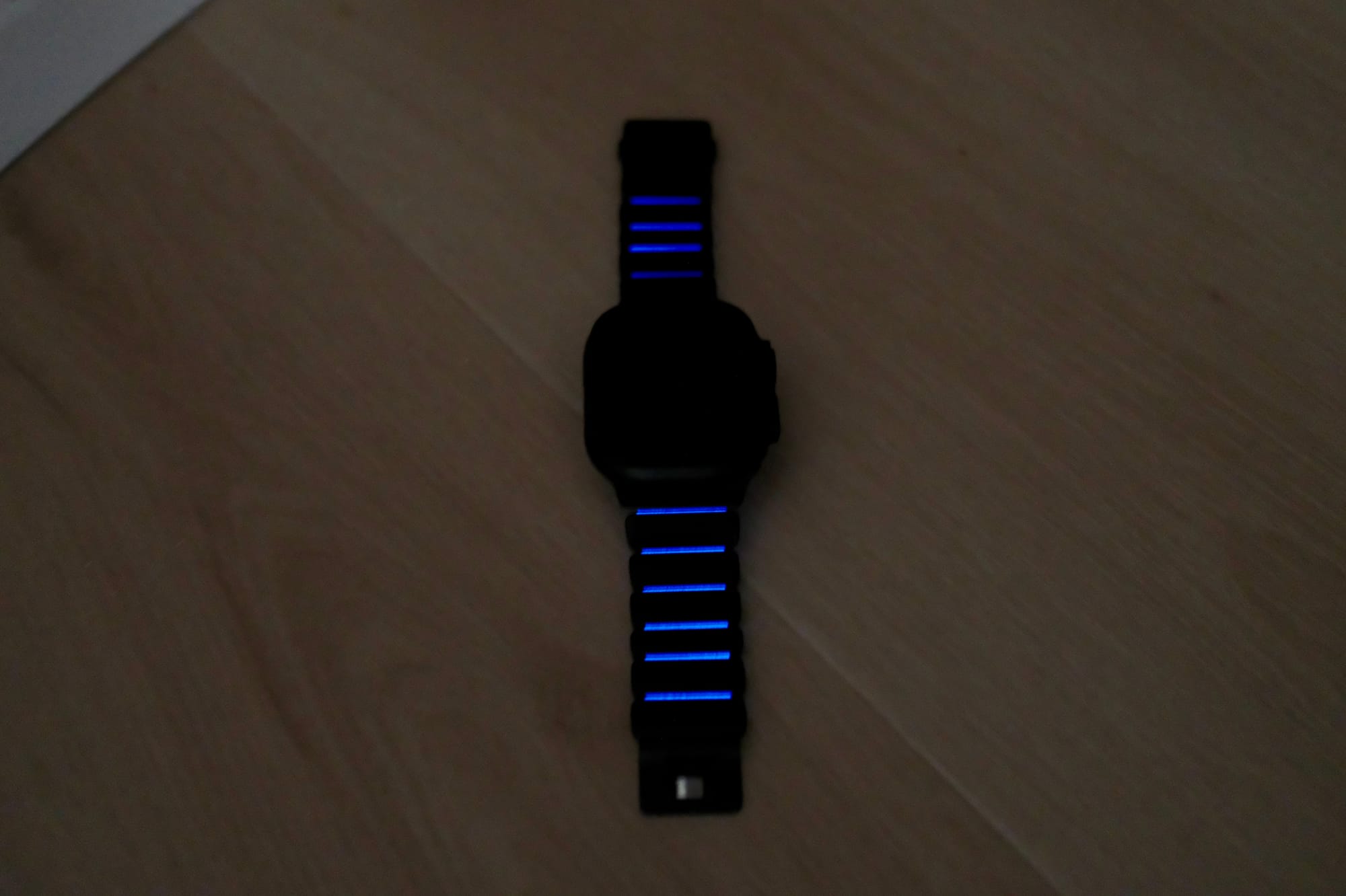 This titanium Apple Watch band glows blue in the dark