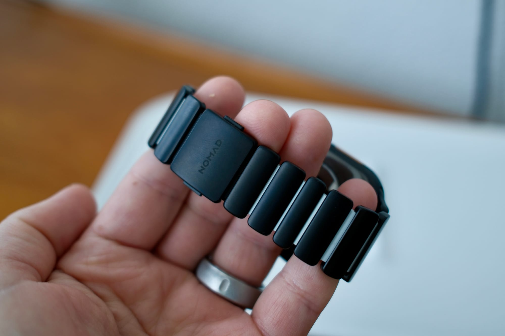 Hands-on with the Nomad Statos Band for Apple Watch in a glow-in-the-dark Icy Blue color.