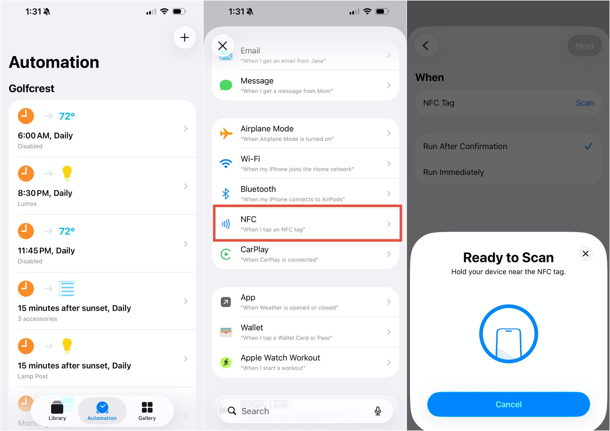 The next time you take a trip, you can select the Open Directions Shortcut and change the hotel destination to the new one. Select the previous automation, tap on the “When” label, and then tap on it again, on the next screen. It will prompt you to scan a new card.